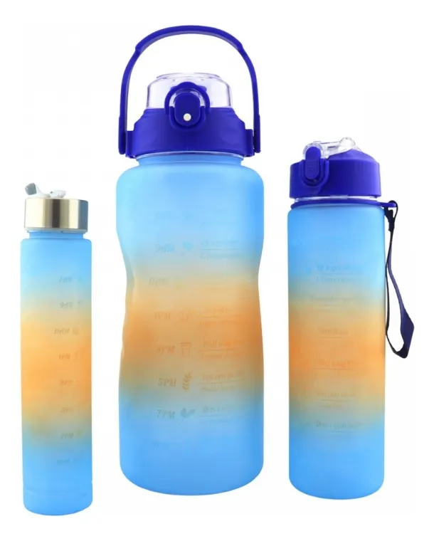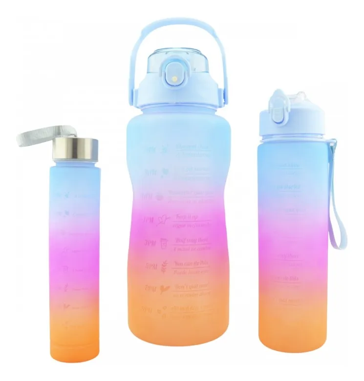 CARACTERÍSTICAS: – Entra uno dentro de otro, para guardar. – Tapa de seguridad, Pitillo Flexible. – Manija en la Tapa. – Apertura de una tecla: abra el pico con una mano para beber fácilmente. – Pajita de silicona: tiene una pajita de silicona emergente para proteger tus dientes. – Boca ancha: la boca ancha diseñada hace que sea fácil llenar la botella deportiva con hielo y fruta – Cómodo de llevar, se puede llevar fácilmente a actividades al aire libre. Incluye set de Stickers. FICHA TÉCNICA Alto: 30 cm Diámetro: 10.7 cm Material: pc, pp, silicona CON ESTA COMPRA RECIBES: 1 termo botella de 2 litros 1 termo botella de 900 ml 1 termo botella de 280 ml El termo grande y el mediano tienen pitillo. Calidad 100% Garantizada. Realizamos Envíos a toda Colombia