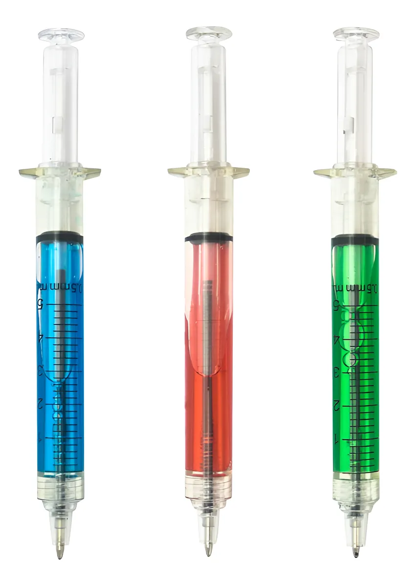 ESFERO JERINGA PLASTICA PACK DE 24 UNIDADES Cuerpo plástico transparente con liquido de colores. Mina delgada retráctil. MEDIDAS Largo 13 cms Material Plástico Calidad 100% Garantizada. Realizamos Envíos a toda Colombia Garantía de fábrica: 15 días