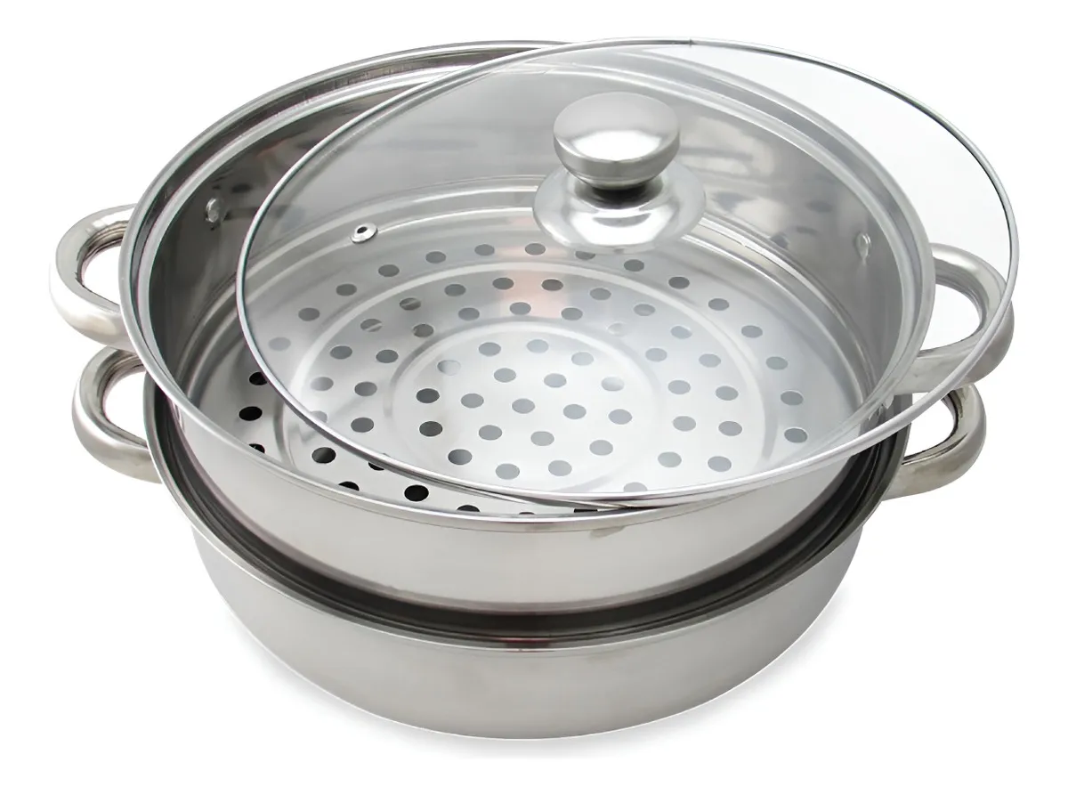 Espectacular olla y vaporera”, ideal para cocinar tus alimentos preferidos de forma saludable. Con ella podrás cocinar los más exquisitos platos sin grasas, ni aceites, conservando así los nutrientes de sus comidas. Además por su practicidad, podrás Cocinar deliciosas comidas al vapor mientras preparas tus sopas. Con esta olla y utilizando una sola hornilla, ahorras tiempo y dinero! Además de ser un accesorio de cocina que te permitirá preparar en el nivel inferior unas deliciosas sopas mientras en el segundo nivel puedes hacer la cocción de unas deliciosas verduras. Medidas: Alto: 16.5 cm Diámetro: 28 cm Material: Acero Inoxidable